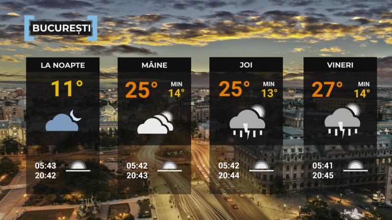 Vremea se va încãlzi uşor faţã de ziua precedentã, astfel valorile termice vor fi apropiate de mediile perioadei. Temperatura maximã va fi de 24...25 de grade, iar cea minimã de 11...14 grade. Cerul va fi temporar noros şi mai ales noaptea vor fi posibile ploi de scurtã duratã. Vântul va sufla slab şi moderat. Presiunea atmosferică va fi în scãdere pe timpul zilei, apoi, seara, noaptea va creşte.