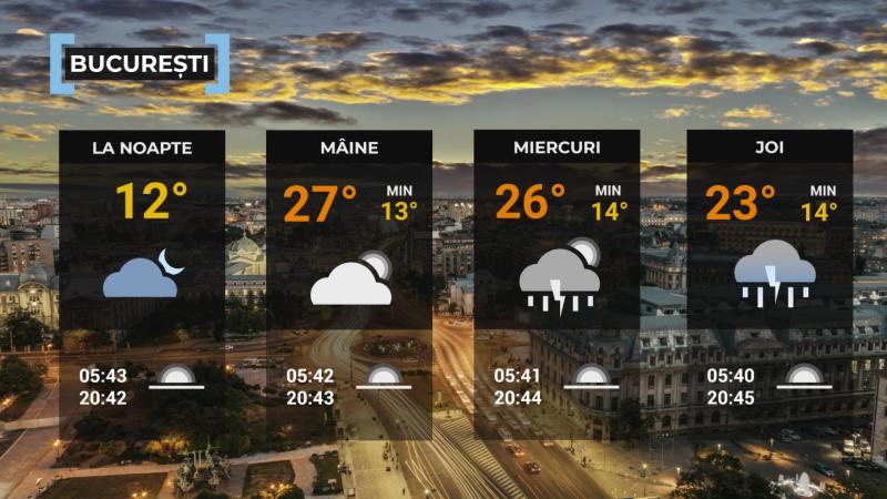 La noapte, cerul va fi variabil, iar vântul va sufla în general moderat. Temperatura minimã va fi de 10...12 grade.