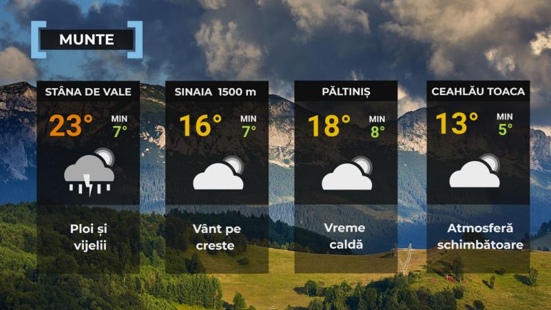 Vremea se va încãlzi, mai semnificativ în regiunile sudice, astfel încât valorile termice se vor situa peste mediile specifice datei în cea mai mare parte a ţãrii. Cerul va fi variabil, cu înnorãri accentuate seara şi noaptea în vestul, sudul şi centrul teritoriului, unde gradul de instabilitate atmosfericã va fi în creştere. Se vor semnala averse şi descãrcãri electrice în Banat, Crişana şi Oltenia, pe arii restrânse în Muntenia şi Transilvania şi izolat în celelalte regiuni. Cantitãţile de apã vor depãşi pe alocuri 15...25 l/mp şi vor fi condiţii de grindinã. Vântul va sufla slab şi moderat, local cu intensificãri în Banat, Transilvania şi Moldova, unde vor fi viteze în general de 55...65 km/h, pe crestele Carpaţilor Meridionali, cu rafale de peste 70...80 km/h, iar de scurtã duratã şi în timpul averselor când vor fi posibile şi vijelii. Temperaturile maxime se vor încadra în general între 20 şi 29 de grade, iar cele minime vor fi cuprinse între 8 şi 17 grade, cu valori uşor mai scãzute în depresiunile Carpaţilor Orientali. Pe suprafeţe mici se va forma ceaţã. Presiunea atmosferică va fi în scãdere.