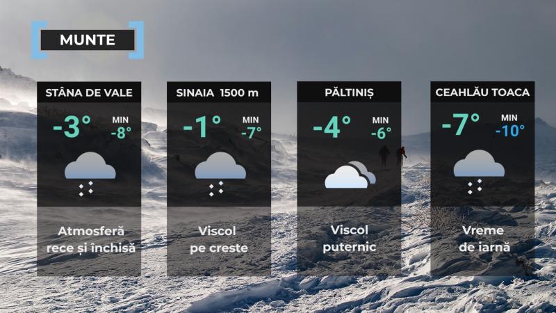 Vremea se va rãci semnificativ faţã de ziua anterioarã, astfel în nord, centru şi nord-est, valorile termice diurne se vor situa sub mediile multianuale specifice acestei date, iar în rest vor fi apropiate de acestea. Pe parcursul zilei aria nebulozitãţii şi precipitaţiilor va fi în restrângere treptatã spre centru, estul şi sud-estul teritoriului; acestea vor fi predominant sub formã de ninsoare în cea mai mare parte a Moldovei, local în Transilvania şi Maramureş şi izolat în dealurile Crişanei şi Banatului, ploi şi trecãtor lapoviţã în Dobrogea şi în jumãtatea de est a Munteniei, iar la munte, temporar va mai ninge. Noaptea, cerul se va înnora treptat, iar precipitaţiile vor cuprinde Banatul, Crişana, nordul Olteniei şi nord-vestul Munteniei, unde vor fi mixte cu depuneri de polei, dar şi Maramureşul, nordul Moldovei şi zona montanã unde vor predomina ninsorile.