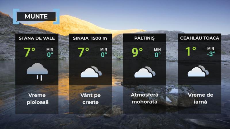 Valorile de temperaturã se vor situa peste mediile multianuale, astfel temperaturile maxime se vor încadra în general între 7 şi 17 grade, iar minimele între 0 şi 11 grade. Cerul va avea înnorãri şi mai ales seara şi noaptea începând din regiunile sud-vestice ploile se vor extinde şi vor cuprinde cea mai mare parte a ţãrii. La munte precipitaţiile vor fi mixte. Vântul va sufla slab şi moderat, cu uşoare intensificãri pe creste. Pe arii restrânse vor fi condiţii de ceaţã. Presiunea atmosferică va fi usor variabilã.