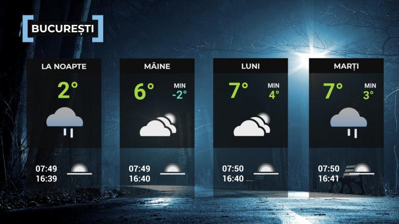 La noapte, cerul va fi noros, iar în prima parte a nopţii temporar va ploua. Vântul va sufla slab pânã la moderat. Temperatura minimã va fi de 1...2 grade. Spre dimineaţã, vor fi condiţii de ceaţã.