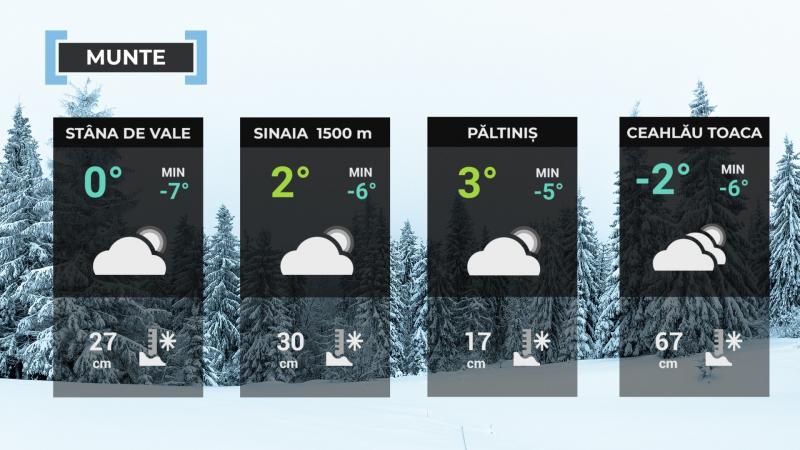 Vremea va fi apropiatã de normalul termic al perioadei. Cerul va fi temporar noros şi doar izolat va ninge slab, cu o probabilitate mai mare spre sfârşitul intervalului în masivele vestice. Vântul va sufla slab şi moderat, cu unele intensificãri ziua în zona înaltã a Carpaţilor Orientali, iar noaptea şi în Munţii Banatului.