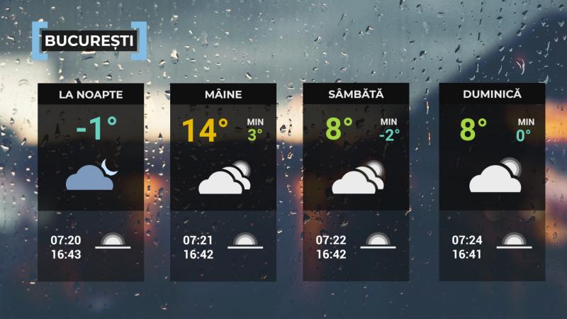 La noapte, cerul va fi variabil, iar vântul va sufla slab şi moderat. Temperatura minimã se va situa în jurul valorii de -2 grade.