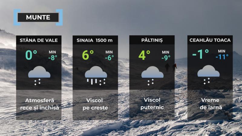 Vremea va fi în general închisã şi vântoasã. Temporar vor fi precipitaţii predominant sub formã de ninsoare şi se va depune un strat de zãpadã, în general, de peste 10...20 cm. Vântul va avea intensificãri, cu viteze la rafalã de 60...80 km/h, iar în special ziua, la altitudini mari, în Munţii Banatului şi în Carpaţii Meridionali va sufla tare cu rafale de peste 100...120 km/h, viscolind puternic ninsoarea, determinând reducerea semnificativã a vizibilitãţii, local spre zero, şi troienirea zãpezii. Pe arii restrânse, la altitudini sub 1400 m, se va forma polei. Valorile termice vor creşte uşor.