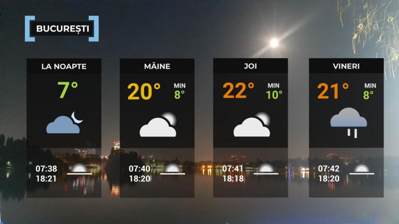 În București, procesul de încălzire a vremii va continua. Cerul va fi variabil, iar vântul va sufla în general slab. Temperaturile se vor menține plăcute pentru această perioadă: maxima va atinge 19-20 de grade, iar minima va coborî la 6–8 grade. În a doua parte a nopții, se va forma ceață în anumite zone ale Capitalei.