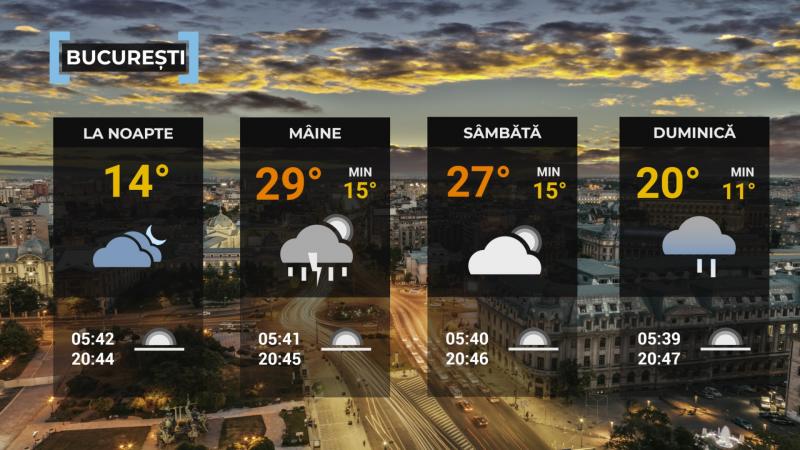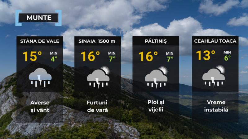 Vremea se va menţine în general instabilã. Vor fi înnorãri temporar accentuate, averse ce vor avea şi caracter torenţial şi descãrcãri electrice, la început în regiunile vestice, apoi şi în restul ţãrii. În intervale scurte de timp sau prin acumulare cantitãţile de apã vor fi de 15...20 l/mp şi izolat de peste 25...30 l/mp şi va cãdea grindinã. Vântul va sufla slab şi moderat, cu intensificãri îndeosebi în timpul ploilor (rafale în general de 50...60 km/h), când vor fi şi vijelii. Temperaturile maxime se vor încadra în general între 19 şi 28 de grade, iar cele minime vor fi cuprinse între 7 şi 15 grade. Dimineaţa şi noaptea pe arii restrânse va fi ceaţã. Presiunea atmosferică va fi variabilã în timpul zilei, apoi va fi în creştere.