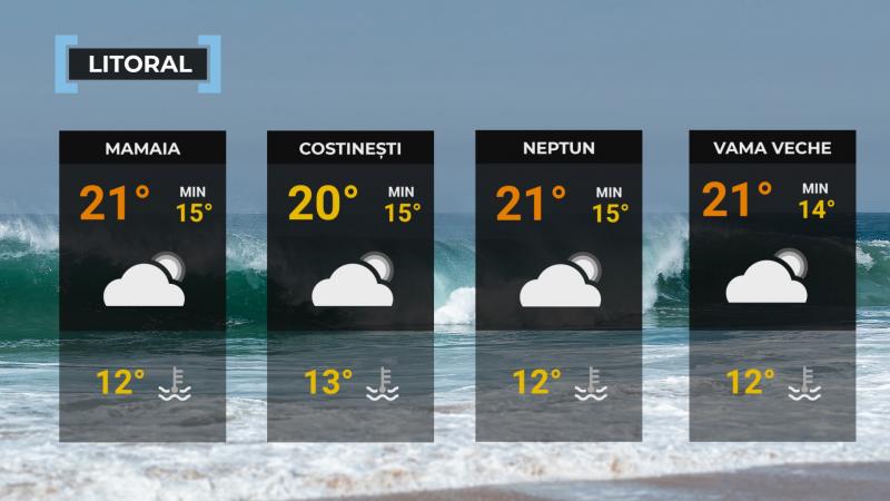 Vremea va fi normalã termic. Cerul va fi variabil, cu înnorãri noaptea, când trecãtor vor fi averse şi descãrcãri electrice. Vântul va sufla slab şi moderat, cu intensificãri asociate averselor. Temperaturile maxime vor fi cuprinse între 18 şi 21 de grade, iar cele minime între 13 şi 15 grade. Temperatura apei mãrii va avea valori între 12 şi 15 grade.