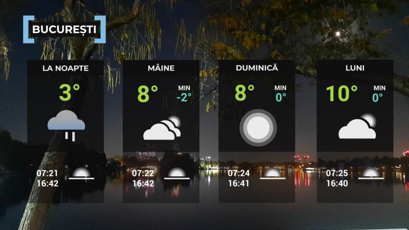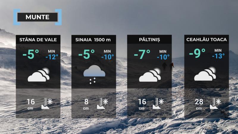 La noapte, vremea va fi în general închisã şi vântoasã în cea mai mare parte a ţãrii. Vor fi precipitaţii mai ales în sud-vest, nord, nord-est şi centru şi vor fi predominant sub formã de ninsoare la munte, unde se va depune un strat de zãpadã, în general, de peste 10...20 cm, în Maramureş, în nordul Crişanei şi al Moldovei, aici stratul de zãpadã nou depus fiind local de peste 5...10 cm, mixte în restul Crişanei, Banat, Transilvania, centrul Moldovei, unde dimineaţa pe suprafeţe mici va mai fi polei şi predominant sub formã de ploaie în Oltenia, local în Muntenia şi sudul Moldovei; în zonele cu ninsoare, temporar aceasta va fi viscolitã. Vântul va prezenta intensificãri temporare în cea mai mare parte a ţãrii, în general, cu viteze de 40...60 km/h, iar în prima parte a zilei, în regiunile vestice rafalele vor depãşi 70...80 km/h. În zonele montane, vor fi viteze ale vântului de 60...80 km/h, iar la altitudini mari, în Munţii Banatului şi în Carpaţii Meridionali vântul va fi tare cu rafale de peste 100...120 km/h, viscolind puternic ninsoarea, determinând reducerea semnificativã a vizibilitãţii, local spre zero, şi troienirea zãpezii. Temperaturile maxime vor fi cuprinse între 2 grade în nord şi 16 grade în sud-est, unde se va încãlzi semnificativ faţã de ziua precedentã.