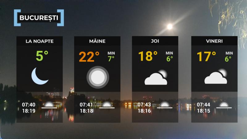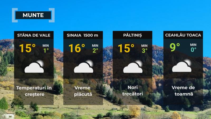 Vremea va fi în general frumoasã, iar valorile termice, îndeosebi cele diurne, se vor situa peste cele specifice datei. Cerul va fi variabil, iar pe arii restrânse, dimineaţa, dar mai ales noaptea, va fi nebulozitate joasã sau ceaţã, posibil asociatã cu burniţã sau ploaie slabã, cu o probabilitate mai mare în nord-est şi est. Vântul va sufla slab pânã la moderat, cu uşoare intensificãri în a doua parte a intervalului în estul şi sud-estul ţãrii. Temperaturile maxime se vor încadra în general între 16 şi 23 de grade, iar cele minime vor fi cuprinse între -2 şi 12 grade. Presiunea atmosferică va fi usor variabilã în vestul ţãrii, iar în rest va fi în creştere.