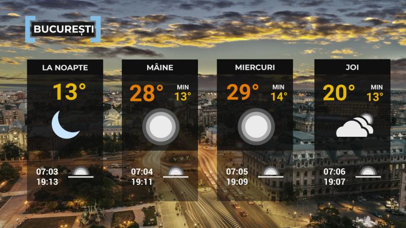 Vremea va fi frumoasã şi caldã. Cerul va fi mai mult senin şi vântul va sufla slab pânã la moderat. Temperatura maximã va fi de 27...28 de grade, iar cea minimã de 11...13 grade. Dimineaţa şi noaptea vor fi condiţii de ceaţã. Presiunea atmosferică va fi cvasi-staţionarã, la valori ridicate.