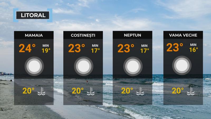 Vremea va fi predominant frumoasã şi caldã. Cerul va fi mai mult senin, iar vântul va sufla slab şi moderat. Temperaturile maxime se vor încadra între 22 şi 25 de grade, iar cele minime între 15 şi 19 grade. Dimineaţa şi noaptea, vor fi condiţii de ceaţã. Temperatura apei mãrii va avea valori de 19...20 de grade.