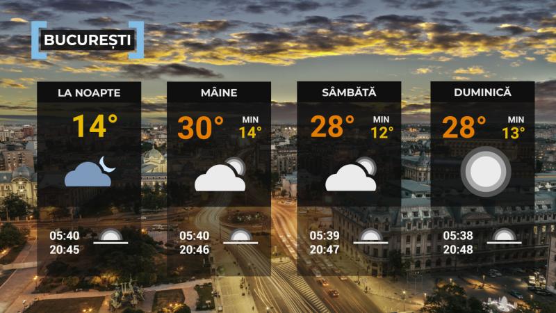 La noapte, cerul va fi variabil, iar vântul va sufla în general slab. Temperatura minimã va fi de 11...14 grade.