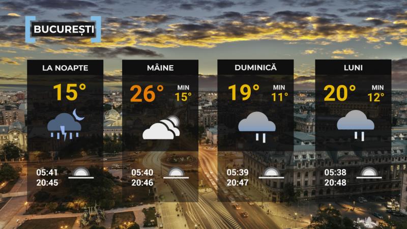 În vestul, sud-vestul, centrul şi nordul ţãrii valorile termice vor scãdea şi se vor situa cu mult sub mediile multianuale specifice perioadei, iar în rest acestea vor fi apropiate de normal. Astfel, temperaturile maxime se vor încadra în general între 13 şi 26 de grade, iar cele minime între 5 şi 16 grade. Ziua, cerul va fi temporar noros şi va ploua în Muntenia, Moldova şi Dobrogea, unde vor fi şi descãrcãri electrice şi pe arii restrânse în celelalte regiuni, iar noaptea nebulozitatea şi aria ploilor se va extinde îndeosebi în jumãtatea de sud-est a teritoriului. Vor fi mai ales averse, ce vor avea şi caracter torenţial, iar în intervale scurte de timp cantitãţile de apã vor fi de 15...25 l/mp şi prin acumulare vor depãşi local 25...40 l/mp. Izolat va cãdea grindinã. Vântul va sufla slab şi moderat, cu intensificãri temporare ( viteze de 45...55 km/h) ziua în sud-vestul Olteniei şi în Transilvania, iar noaptea în estul Munteniei şi jumãtatea sudicã a Moldovei, dar de scurtã duratã şi în timpul ploilor, când vor fi şi vijelii. Pe arii restrânse se va forma ceaţã. Presiunea atmosferică va fi în creştere uşoarã (valori apropiate de cea consideratã normalã).