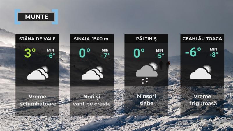 În restul țării, cerul va fi variabil, cu înnorări și precipitații slabe cantitativ în prima parte a zilei: ninsoare în sudul Transilvaniei și pe arii restrânse în Muntenia, precum și în zona montană aferentă, precipitații mixte în Banat și predominant ploi izolat în Dobrogea. Vântul va sufla slab și moderat, cu intensificări la munte, în sudul Banatului, dar și în regiunile sudice pe parcursul zilei, unde rafalele vor atinge 50–70 km/h, mai ales în Muntenia, sudul Olteniei și pe litoral, accentuând senzația de rece.