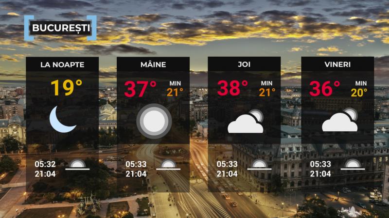 Va fi caniculã, disconfortul termic ridicat, iar indicele temperaturã-umezealã (ITU) va depãşi uşor pragul critic de 80 de unitãţi. Cerul va fi mai mult senin, iar vântul va sufla slab şi moderat. Temperatura maximã va fi de 36...37 de grade, iar cea minimã de 18...21 de grade, caracterizând în centrul oraşului o noapte tropicalã. Presiunea atmosferică va fi uşor variabilã.