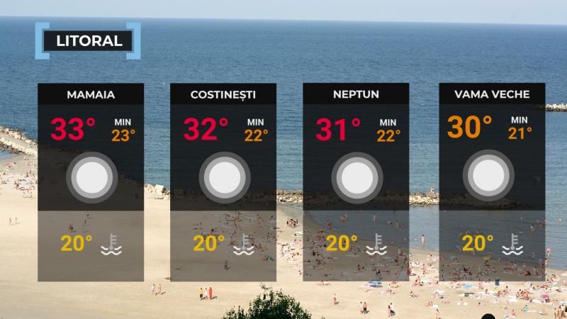 Vremea va fi cãlduroasã, iar disconfortul termic va fi ridicat. Indicele temperaturã-umezealã (ITU) va atinge, pe alocuri, pragul critic de 80 de unitãţi. Temperaturile maxime vor fi cuprinse între 28 şi 33 de grade, iar cele minime se vor încadrea între 20 şi 23 de grade. Cerul va fi mai mult senin, iar vântul va sufla în general slab şi moderat. Temperatura apei mãrii va avea valori de 20...21 de grade.