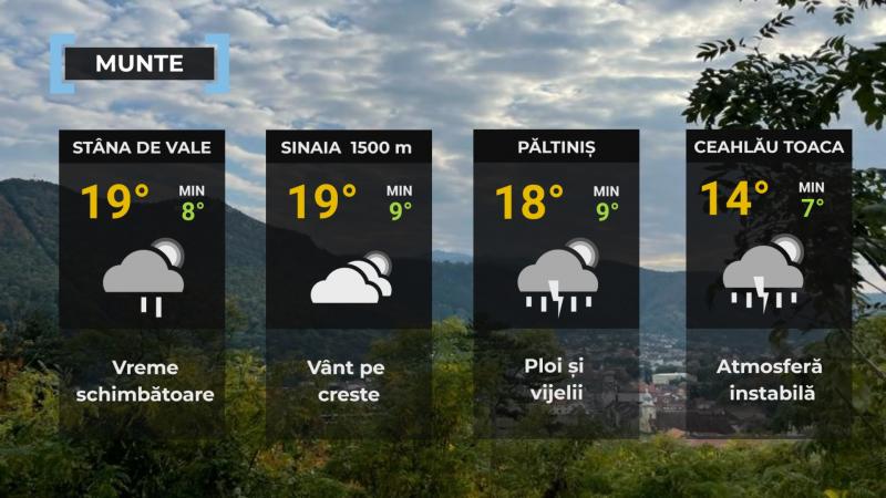 Gradul de instabilitate atmosfericã va fi ridicat şi se va manifesta prin înnorãri temporar accentuate, averse ce vor avea şi caracter torenţial şi descãrcãri electrice în Carpaţii Occidentali şi în nordul Carpaţilor Orientali. Cantitãţile de apã vor depãşi pe alocuri 15...25 l/mp şi vor fi condiţii de grindinã. În restul zonei cerul va fi variabil, iar ploi de scurtã duratã se vor semnala pe spaţii mici. Vântul va sufla slab şi moderat, cu intensificãri în special pe creste şi asociate ploilor, rafale de 50...60 km/h. Valorile termice vor fi peste normele perioadei.