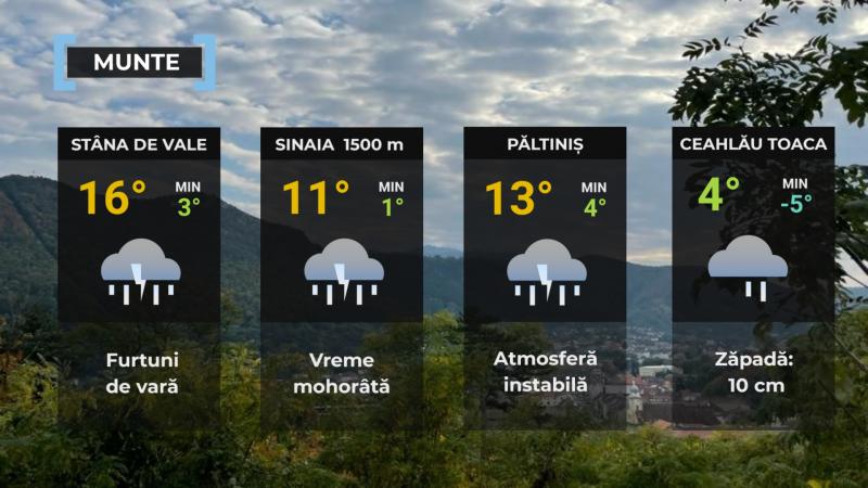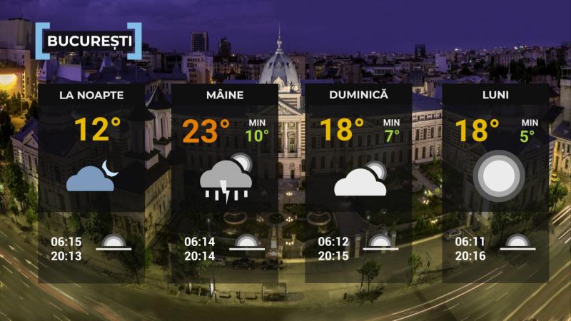 Vremea va fi în general instabilã şi se va menţine caldã în majoritatea zonelor ţãrii, deşi valorile termice vor înregistra o scãdere faţã de ziua anterioarã îndeosebi în est, sud-est şi la munte. Vor fi perioade cu înnorãri accentuate, averse ce vor avea şi caracter torenţial şi descãrcãri electrice, ziua în Transilvania, Banat, Oltenia, Muntenia, Dobrogea, jumãtatea de sud a Moldovei şi a Crişanei şi izolat în rest, iar noaptea local în Oltenia, Banat şi în sud-vestul Transilvaniei, pe arii restrânse în Crişana şi Muntenia şi doar izolat în celelalte regiuni. Îndeosebi în centrul şi în sudul ţãrii, în intervale scurte de timp sau prin acumulare, cantitãţile de apã vor fi de 20...30 l/mp şi izolat de peste 50 l/mp şi vor fi cãderi de grindinã. Vântul va avea intensificãri în cea mai mare parte a Moldovei, precum şi în nordul Crişanei (viteze de 50...70 km/h şi izolat de 80 km/h), dar de scurtã duratã şi în timpul ploilor (viteze de 50...70 km/h) şi izolat vor fi vijelii. Temperaturile maxime se vor încadra între 15 grade în nordul Moldovei şi în estul Transilvaniei şi 27 de grade în sud-vestul Olteniei, iar cele minime vor fi cuprinse între 2 şi 12 grade, mai scãzute în depresiunile intramontane, spre 0 grade. Izolat, dimineaţa şi noaptea, va fi ceaţã. Presiunea atmosferică va fi în creştere.