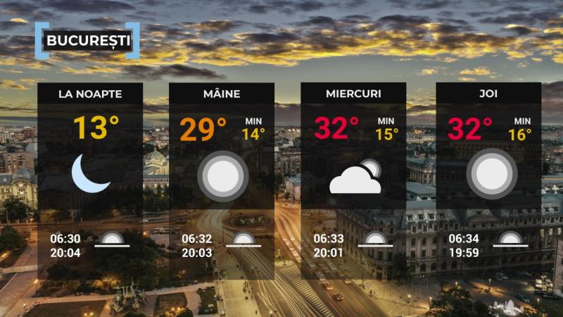 Vremea va fi frumoasã, dar rãcoroasã dimineaţa şi noaptea. Cerul va fi mai mult senin, iar vântul va sufla slab pânã la moderat. Temperatura maximã va fi de 28...29 de grade, iar cea minimã de 10...14 grade, cu cele mai mici valori în zona periurbanã. Presiunea atmosferică va fi usor variabilã.