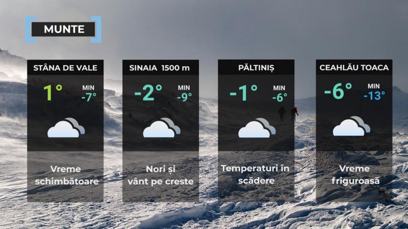 La munte, vântul va avea intensificări care vor amplifica senzația de rece, în special la altitudini mari, în Carpații Meridionali și de Curbură (rafale de peste 80-100 km/h). Sunt aşteptate ninsori slabe.