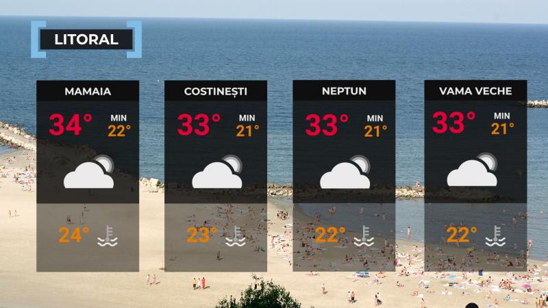 Vremea se va menţine cãlduroasã. Disconfortul termic va fi accentuat, iar indicele temperaturã-umezealã (ITU) va depãşi pragul critic de 80 de unitãţi. Temperaturile maxime se vor încadra între 29 şi 34 de grade, iar cele minime între 21 şi 23 de grade. Cerul va fi variabil, cu înnorãri spre searã şi noaptea. Mai ales în timpul nopţii, trecãtor vor fi averse, descãrcãri electrice şi intensificãri ale vântului ce pot lua aspect de vijelie. Vântul va sufla moderat, cu intensificãri temporare - rafale, în general, de 45 - 55 km/h. Temperatura apei mãrii va avea valori cuprinse între 22 şi 25 de grade.