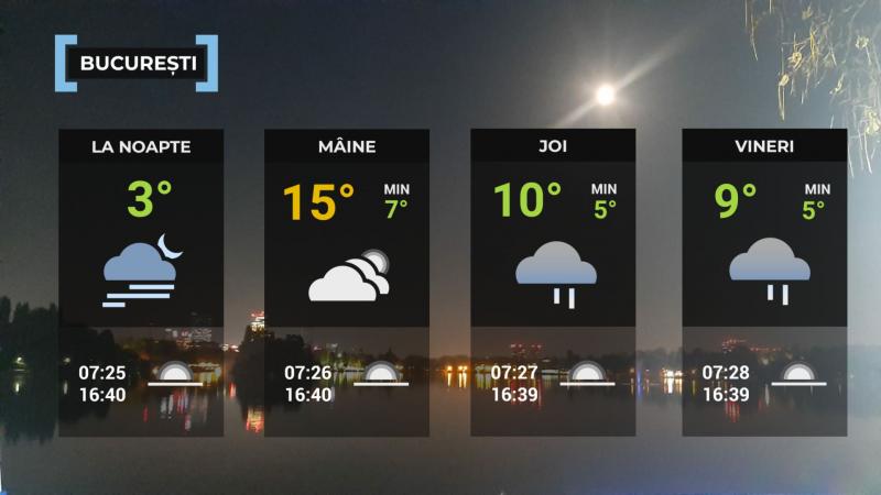 La noapte, cerul va fi variabil, cu nebulozitate joasã şi ceaţã din a doua parte a nopţii. Vântul va sufla slab pânã la moderat. Temperatura minimã va fi de 1...3 grade.