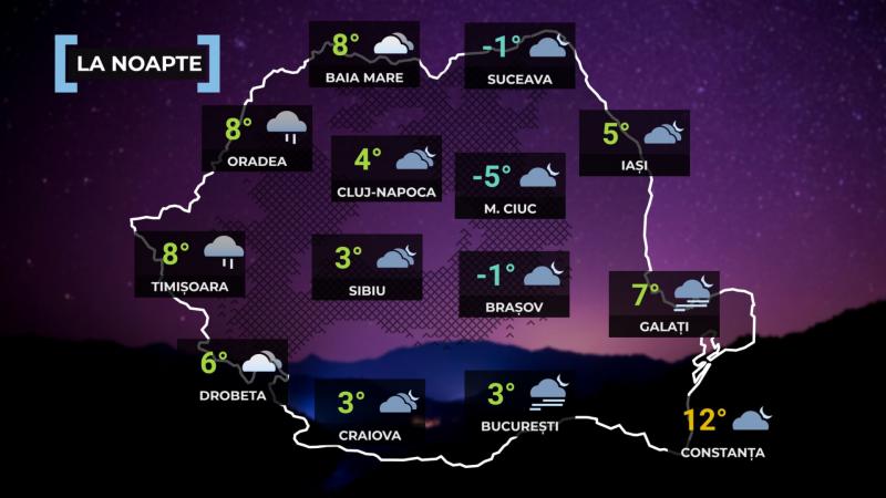 La noapte, cerul va fi variabil, cu înnorãri şi ploi slabe pe arii restrânse în Banat şi Crişana. În Carpaţii Occidentali şi în vestul Carpaţilor Meridionali, la altitudini mari, izolat vor fi precipitaţii sub formã de lapoviţã şi ninsoare. Vântul va sufla slab şi moderat, temporar cu intensificãri în Banat şi în sudul Crişanei, cu viteze de 55...65 km/h şi pe litoral de 50...55 km/h. În Carpaţii Meridionali şi Occidentali, rafalele vor fi de 70...80 km/h, iar la altitudini de peste 1700 m vor atinge 90...110 km/h. Temperaturile minime se vor situa între -5 grade în depresiunile Carpaţilor Orientali şi 12 grade pe litoral. Pe arii restrânse în estul şi sud-estul ţãrii va fi ceaţã, posibil asociatã cu burniţã.