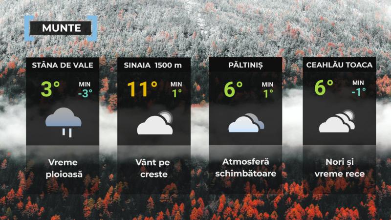 Cerul va fi temporar noros şi local va ploua. Pe creste, în a doua parte a intervalului, vor fi precipitaţii mixte. Vântul va sufla slab şi moderat, cu intensificãri de peste 90 km/h în zona înaltã. Valorile termice vor fi în scãdere în masivele vestice, iar în rest se vor menţine comparabile cu cele din ziua precedentã.