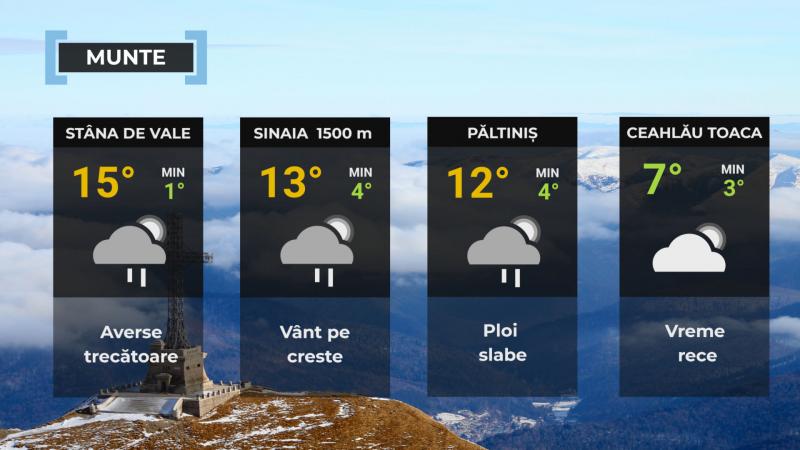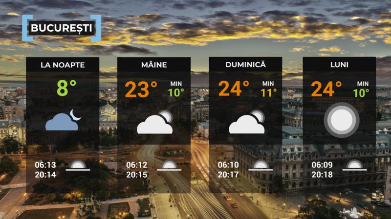 Vremea va fi în general frumoasã şi se va încãlzi în cea mai mare parte a ţãrii, astfel cã valorile termice se vor situa uşor peste cele specifice perioadei. Cerul va fi variabil, cu înnorãri temporare ziua în zona montanã şi în regiunile vestice unde pe arii restrânse vor fi averse slabe şi posibil descãrcãri electrice. Vântul va sufla slab şi moderat, cu unele intensificãri în vestul teritoriului. Temperaturile maxime se vor încadra între 17 şi 23 de grade, iar cele minime vor fi cuprinse între 4 şi 13 grade, mai coborâte în estul Transilvaniei, spre 1 grad. Dimineaţa şi noaptea, izolat vor fi condiţii de ceaţã. Presiunea atmosferică va fi în creştere.