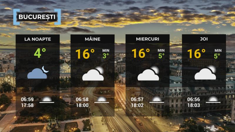 La noapte, cerul va fi variabil, însã spre sfârşitul nopţii vor fi condiţii pentru formarea de nori joşi şi ceaţã. Vântul va sufla slab şi moderat. Temperatura minimã va fi de 2...4 grade.
