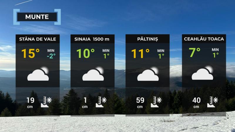 Vremea va fi în continuare mult mai caldã decât în mod normal, astfel, temperaturile maxime se vor încadra între 8 grade în deltã şi 20...21 de grade în zonele deluroase din vest, iar cele minime vor fi cuprinse în general între -3 şi 8 grade. Cerul va fi variabil, însã dimineaţa şi mai ales noaptea, pe alocuri, în special în sud şi în est, vor fi nori joşi şi ceaţã, cu probabilitate mai mare în Dobrogea, unde pot persista. Vântul va sufla slab şi moderat, cu intensificãri locale pe crestele Carpaţilor Meridionali şi în Banat. Presiunea atmosferică va fi uşor variabilã în timpul zilei, apoi noaptea va fi în creştere.