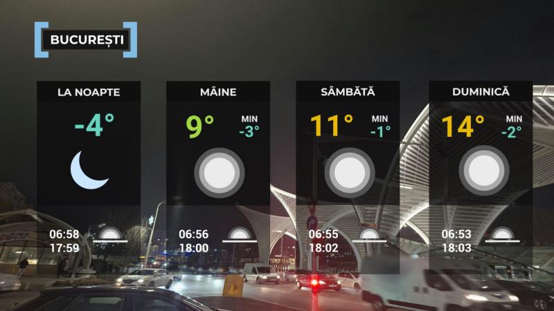 Vremea va fi predominant frumoasã, iar valorile termice diurne vor creşte uşor faţã de ziua anterioarã mai ales în jumãtatea de vest a ţãrii, însã dimineaţa şi noaptea va fi rece. Cerul va fi mai mult senin, iar vântul va sufla slab şi moderat. Temperaturile maxime se vor încadra în general între 4 şi 12 grade, iar cele minime între -9 şi 3 grade, mai scãzute în depresiunile din estul Transilvaniei spre valori în jurul a -14 grade unde va fi ger. Dimineaţa şi noaptea, izolat va fi ceaţã.