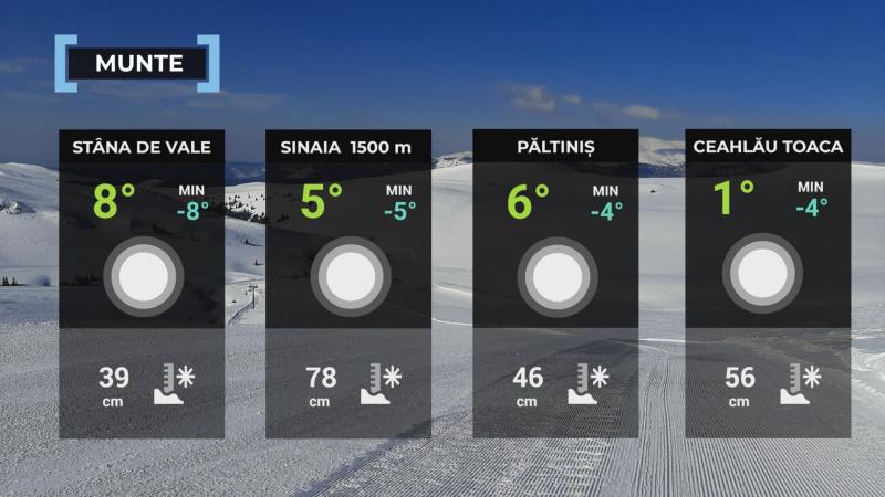 La noapte, vremea va fi rece. Cerul va fi mai mult senin, iar vântul va sufla slab pânã la moderat. Temperatura minimã va fi de -7...-4 grade.