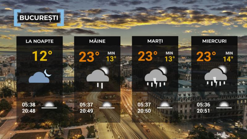 Valorile termice diurne vor fi mai scãzute decât în ziua anterioarã. Cerul va avea înnorãri şi trecãtor va ploua slab. Vântul va avea unele intensificãri ziua, dar va sufla slab şi moderat pe parcursul nopţii. Temperatura maximã va fi în jurul a 23 de grade, iar cea minimã de 10...13 grade.