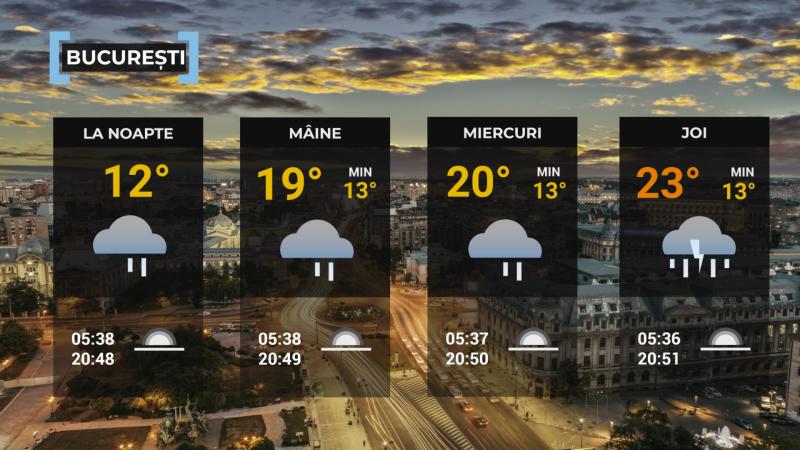 Valorile termice se vor situa sub cele specifice datei în jumãtatea de est a ţãrii, unde înnorãrile vor persista şi temporar va ploua însemnat cantitativ (local 15...20 l/mp şi pe arii restrânse peste 25...30 l/mp). În restul teritoriului, valorile termice vor fi apropiate de mediile multianuale, cerul va avea înnorãri temporare şi local vor fi ploi. Izolat se vor semnala descãrcãri electrice. La altitudini foarte mari la munte vor fi precipitaţii sub formã de lapoviţã şi ninsoare. Vântul va sufla slab şi moderat, cu intensificãri temporare mai ales în sud-vestul, vestul, nordul şi estul ţãrii, cu viteze în general de 40...50 km/h, iar în zona montanã înaltã rafalele vor depãşi 80...90 km/h. Temperaturile maxime se vor încadra între 13 şi 23 de grade, iar cele minime între 7 şi 14 grade. Dimineaţa şi noaptea izolat se va forma ceaţã. Presiunea atmosferică va fi usor variabilã.
