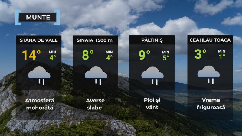 În Carpaţii Orientali şi în jumãtatea esticã a Carpaţilor Meridionali înnorãrile vor persista şi temporar va ploua însemnat cantitativ (local 15...20 l/mp şi pe arii restrânse peste 25...30 l/mp). În restul zonei montane, cerul va fi temporar noros şi local vor fi ploi slabe. La altitudini foarte mari vor fi precipitaţii sub formã de lapoviţã şi ninsoare. Vântul va avea intensificãri temporare, cu viteze în general de 40...50 km/h, iar în zona înaltã rafalele vor depãşi 80...90 km/h. Valorile termice vor fi comparabile cu cele din ziua precedentã în majoritatea masivelor.