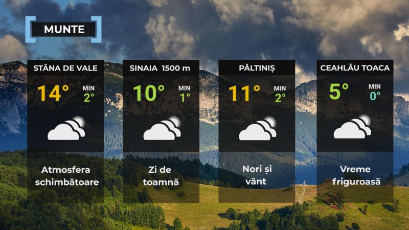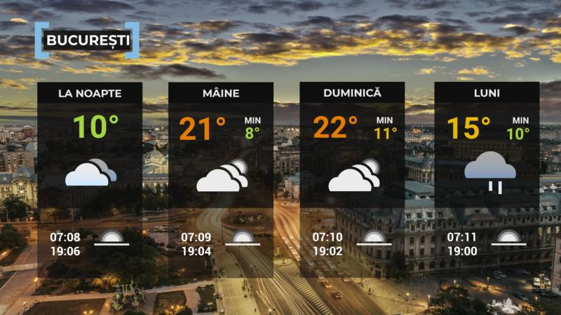 În sudul, estul şi centrul ţãrii valorile termice se vor menţine sub cele specifice perioadei, iar în rest vor fi apropiate de mediile multianuale. Cerul va fi variabil, cu înnorãri şi cu totul izolat ploi slabe în jumãtatea sud-vesticã a ţãrii. Vântul va sufla slab şi moderat, cu intensificãri în temporare ziua în judeţul Caraş-Severin cu rafale de 55...70 km/h, iar în zona montanã aferentã de 80...90 km/h, însã cu viteze mai mici local şi în Dobrogea. Temperaturile maxime se vor încadra între 14 şi 22 de grade, iar cele minime vor fi cuprinse între 2 şi 12 grade, mai coborâte în depresiuni. Noaptea, pe arii restrânse va fi ceaţã, iar izolat în depresiuni se va depune brumã. Presiunea atmosferică va fi în uşoarã scãdere.