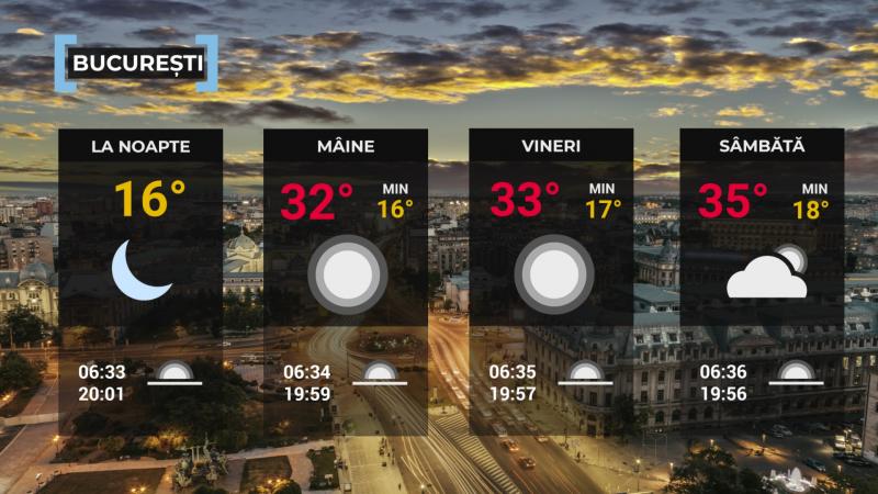 La noapte, cerul va fi senin, iar vântul va sufla slab pânã la moderat. Temperatura minimã va fi de 13...16 grade.