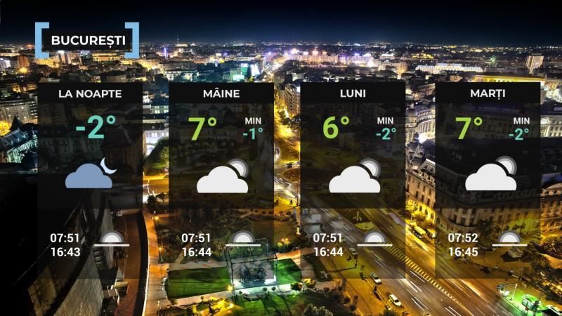 În București, cerul va fi variabil. Vântul va sufla moderat (30-40 km/h), cu intensificări după-amiaza și seara, când rafalele pot ajunge la 50-60 km/h. Temperatura maximă va fi de 6-7 grade, iar minima se va situa între -4 și -1 grad.