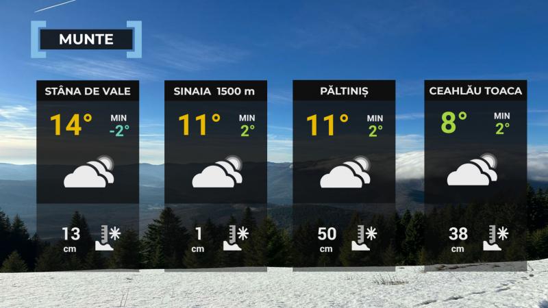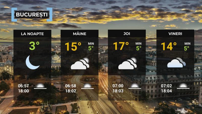 La noapte, cerul va fi variabil, iar vântul va sufla slab şi moderat, cu intensificãri temporare în sudul Banatului (viteze în general de 40...50 km/h). Temperaturile minime se vor încadra între -3 şi 10 grade, cu valori mai mici în depresiuni. Se va forma ceaţã, local în sud-estul ţãrii, unde vor fi condiţii de burniţã, şi pe alocuri în celelalte zone.