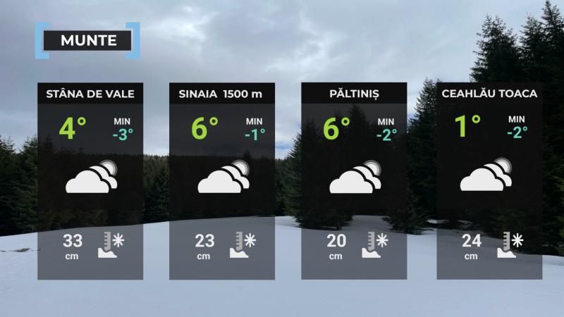 La munte, vremea se va menține rece, cu temperaturi negative. Probabilitatea de precipitații este ridicată, iar în zona submontană acestea vor fi mixte. La altitudini mari, va ninge. Vântul va sufla moderat, cu intensificări în zonele montane înalte, unde rafalele vor atinge 60...70 km/h.