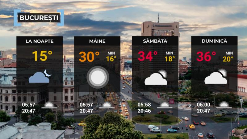 La noapte, cerul va fi variabil, mai mult senin în a doua parte a nopţii. Vântul va sufla slab pânã la moderat. Temperatura minimã, semnificativ mai scãzutã faţã de noaptea precedentã, va fi de 13...15 grade.