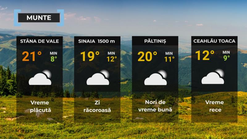 Vremea va fi frumoasã şi se va încãlzi. Cerul va fi mai mult senin, exceptând regiunile nordice, unde spre searã şi noaptea, pe arii restrânse, vor fi averse şi descãrcãri electrice. Vântul va sufla slab şi moderat, cu uşoare intensificãri ziua pe crestele montane, precum şi în nord-vest şi în est. Temperaturile maxime se vor încadra între 23 de grade în zonele depresionare din Maramureş şi estul Transilvaniei şi 31 de grade în Lunca Dunãrii. Minimele termice vor fi cuprinse între 7 grade în estul Transilvaniei şi 20 de grade în nordul litoralului şi în Dealurile de Vest.