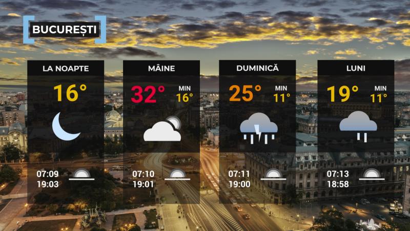 La noapte, cerul va fi mai mult senin, iar vântul va sufla slab pânã la moderat. Temperatura minimã, mai ridicatã decât în mod obişnuit, va fi de 14...16 grade.