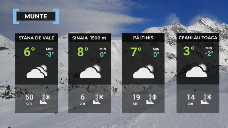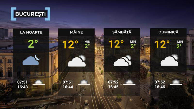 Valorile termice vor fi în continuare mai mari decât cele specifice datei. Cerul va fi variabil, cu unele înnorãri noaptea în regiunile vestice, unde izolat vor fi posibile ploi slabe. Vântul va sufla slab şi moderat, cu intensificãri temporare, ziua, la munte. Temperaturile maxime se vor încadra, în general, între 6 şi 15 grade, iar cele minime se vor situa între -4 şi 5 grade. Dimineaţa şi noaptea, local în regiunile extracarpatice şi izolat în rest, va fi nebulozitate joasã sau ceaţã. Presiunea atmosferică va fi în uşoarã scãdere.