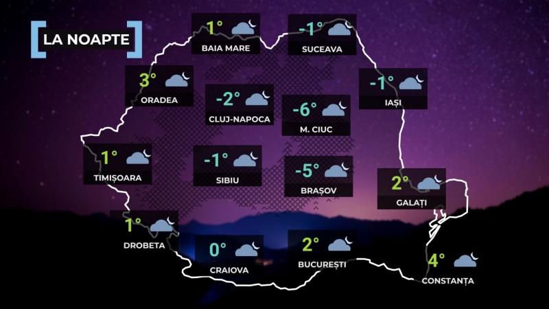 La noapte, cerul va fi variabil, iar vântul va sufla slab şi moderat, cu intensificãri temporare la munte, în special în zona înaltã a Carpaţilor Orientali. Temperaturile minime se vor situa între -7...-4 grade, în depresiuni, şi 5 grade pe litoral. Spre sfârşitul intervalului, în zonele joase de relief, izolat va fi nebulozitate joasã sau ceaţã.
