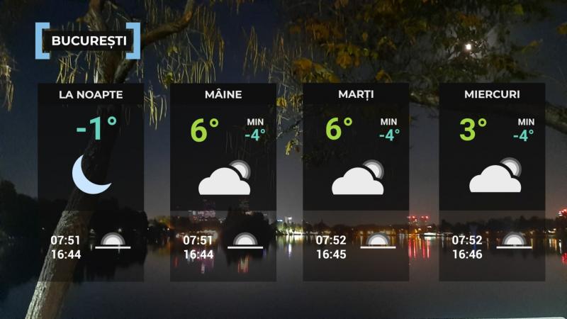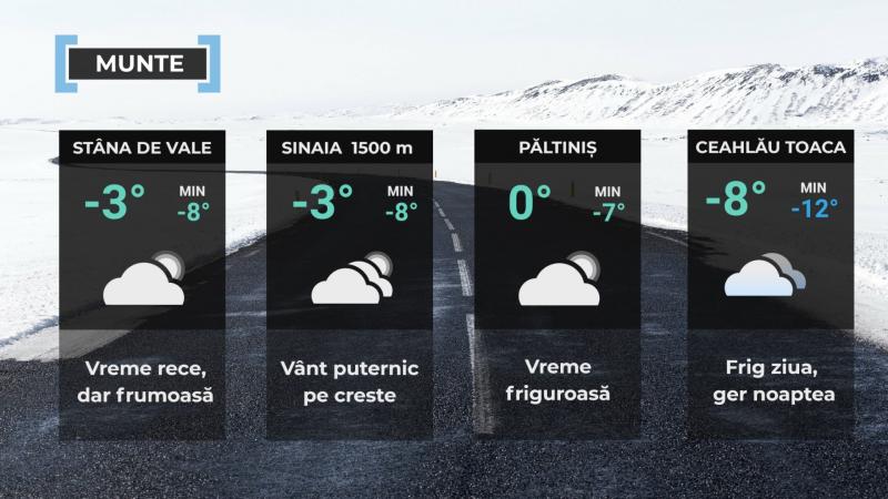 Cerul va fi mai mult senin, iar vântul va sufla moderat (viteze de 30...40 km/h). Temperatura minimă va fi de -4 - -1 grad.