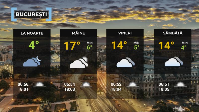 La noapte, cerul va avea înnorãri temporare şi vor fi condiţii de ceaţã, iar vântul va sufla slab pânã la moderat. Temperatura minimã va fi de 2...4 grade.