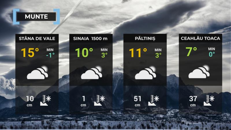 Vremea va fi mult mai caldã decât în mod obişnuit pentru aceastã datã. Cerul va avea înnorãri temporare şi mai ales în timpul nopţii va ploua slab, cu precãdere în masivele sudice, iar în zona înaltã a Carpaţilor Meridionali, trecãtor vor fi precipitaţii mixte. Vântul va sufla slab şi moderat, cu uşoare intensificãri în Carpaţii Meridionali.